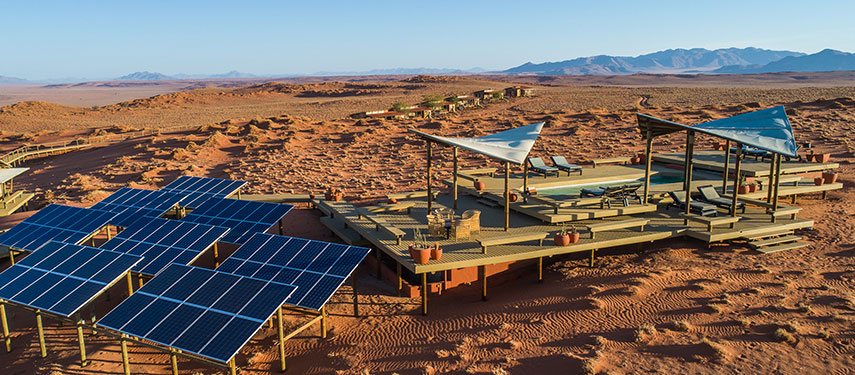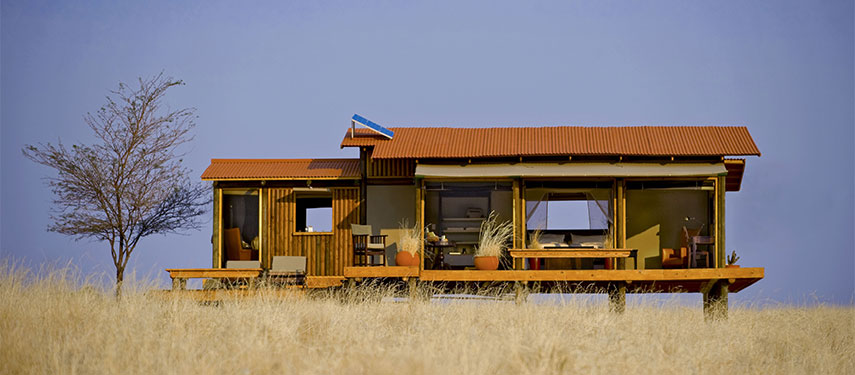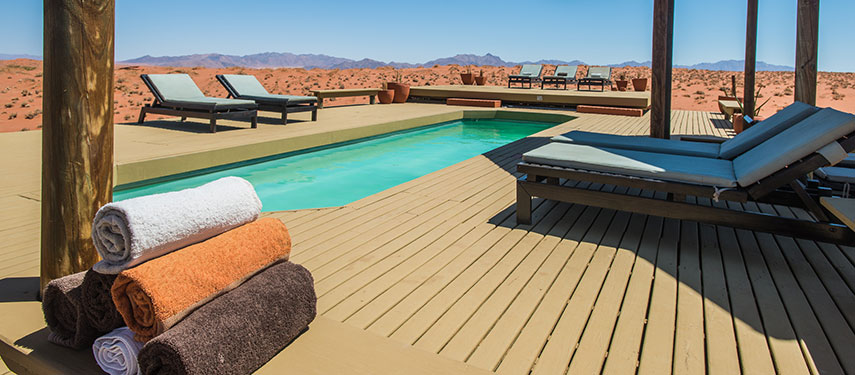 The 10 chalets are built on stilts with wrap around verandahs and a 360 degree view of the surrounding desert and the lodge’s unique swimming pool is suspended above the sand.