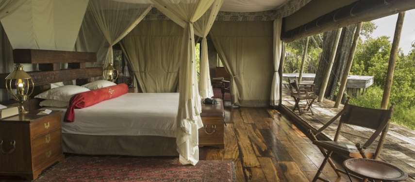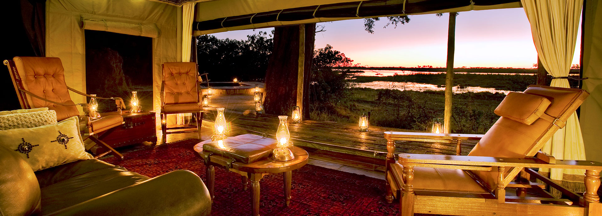 Zarafa Camp has four large, sumptuous tents and their generous verandas are positioned under cool and shady trees with spectacular views onto the Zibadianja Lagoon. The spacious bedrooms have a lounge, ensuite bathrooms with copper baths, indoor as well as outdoor showers, copper heaters for cosy winters as well as their own private pools for summer. The main area is furnished in the same style as the tents and evokes the traditional safari ambiance of the turn of the last century.