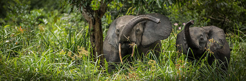 Our encounter with a second group the next morning is even harder-won: though the walk is mostly flat this time, the bush is even less penetrable and as we approach our quarry it begins to rain. Our tracker stops periodically to listen, then continues hacking a course through the undergrowth. We plunge through it, and the bush parts before us to reveal a magnificent silverback perched in a tree. Everything is silent bar the patter of rain and the stripping of leaves from the bark as the silverback brings them to his mouth. What a miracle it is, to observe our wild relatives from deep inside this vast and inscrutable equatorial rainforest.
