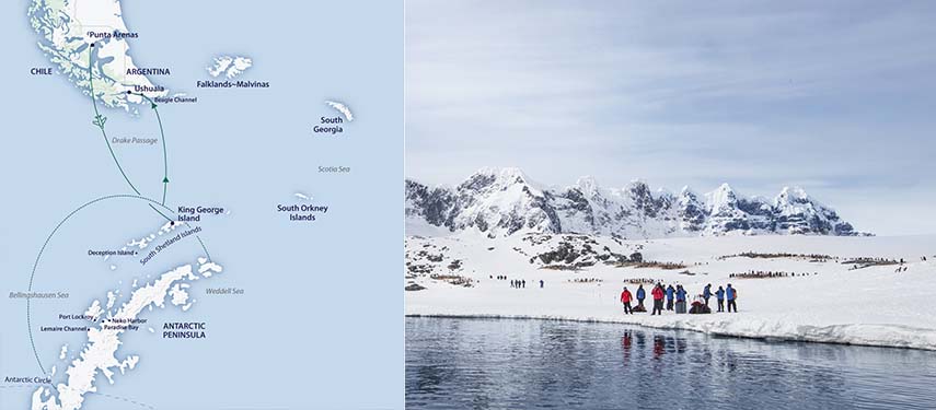 Day 1 | Arrival airport transfer and overnight in Punta Arenas Day 2 | Fly Punta Arenas to King George Island. Embarkation Days 3-9 | Antarctic Peninsula & Antarctic Circle Days 10-11 | Drake Passage crossing Day 12 | Disembark Ushuaia