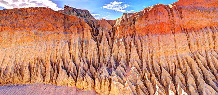 Awaken to the peace and serenity surrounding us at the Wilderness lodge. Our local guide will take us through some of the most spectacularly rugged country on earth and share their knowledge of Arkaroola’s 1,600 million year geological history on the ‘Ridgetop Tour’. We then make our way to Mungo National Park via Broken Hill. Our flight path takes us over Lake Frome, a dessert-like melange of gold earth and swirling white salt pans, an amazing sight from above. This evening, our local guide at Mungo National Park will take us on a sunset tour walking the iconic Walls of China, where scientists have discovered artefacts dating back over 50,000 years.