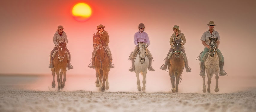 On arrival by air or road, you will be greeted by your host and guide David Foot and settled into Camp Kalahari on the edge of the Makgadikgadi Salt Pans. Head off after tea in the beautiful afternoon light, for an introductory ride – primarily to match horse and rider but also your first opportunity to experience the beauty of this magical area.