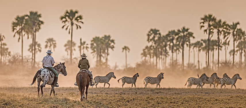 This five night example ride follows the meandering shoreline of the Makgadikgadi Salt Pans’ ancient lake bed and combines three nights at Camp Kalahari, a delightfully relaxed traditional tented safari camp on one of the palm thronged islands, with two nights fly camping out on the Pans under the stars. You will interact with the fascinating Zu/’Hoasi tribespeople and ride amongst desert adapted wildlife including meerkat clans, brown hyenas, and aardwolves. At the height of the migration season, the grasslands are awash with zebra, wildebeest, hartebeest, and ostrich – and of course the attendant predators!