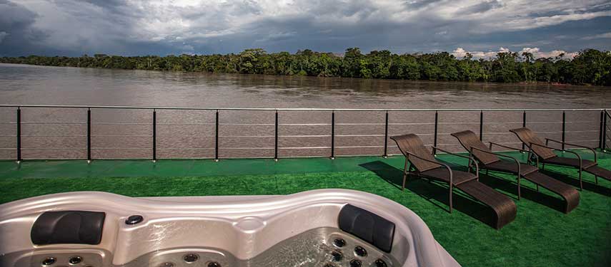 Its eighteen air-conditioned, ensuite suites feature ample sitting areas, large, comfortable beds, panoramic windows and private balconies. When passengers are not out on jungle explorations they can enjoy the comforts of the common reading room, enjoy a drink in the alfresco lounge, take a dip in the outdoor Jacuzzi or take in the beautiful scenery from the observation deck. Dine on refreshing and irresistible tropical cuisine, from adventurous Ecuadorian dishes as you share tales of your adventures with fellow guests.
