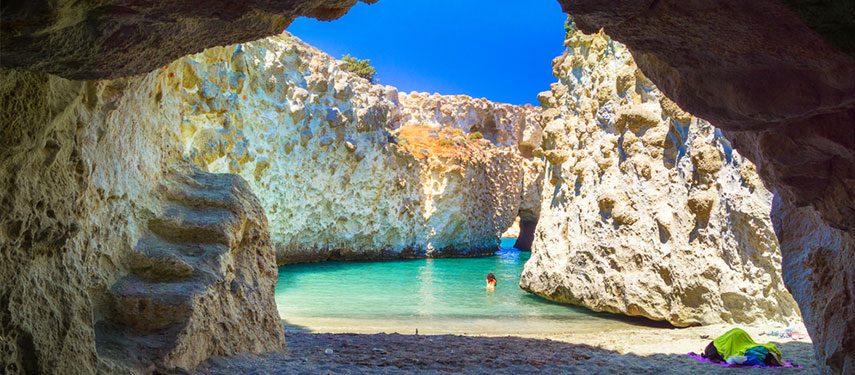 Milos is a volcanic island with many different and mind-blowing beaches due to its volcanic geography. As most of these beaches are quite isolated, a great way to fully explore them would be a sailing experience to have some fun swimming snorkelling time, during which you might also have the chance to go inside one of the many caves made of volcanic rocks of the island!