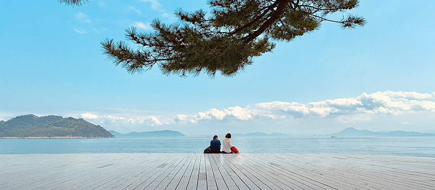 A quiet coastal platform on Naoshima Island overlooking the Seto Inland Sea, blending contemporary design with natural calm.