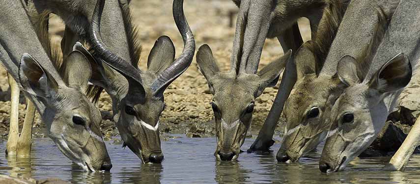 Etosha National Park, or the ‘Great White Place’, covers a huge area with about one quarter made up of saline depressions or ‘pans’. Etosha Pan, a saline desert, is the largest pan in the region. The park is home to 114 mammal and over 340 bird species. Here you might find the Big 5 and a wild variety of antelope including the endemic black faced impala.