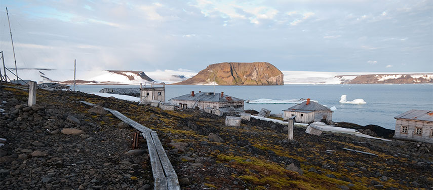 Tikhaya Bukhta is currently a Russian Arctic National Park ranger station occupying Soviet-era research buildings and was also a major base for polar expeditions. Nearby, the fascinating columnar basalt cliffs of Rubini Rock are home to thousands of nesting seabirds.