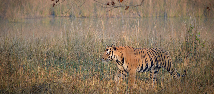 After an early breakfast, drive for two hours to the northern part of Satpura Tiger Reserve, and begin walking across the undulating hills, which gradually descend to a new part of the Denwa River. After a picnic lunch, you will reach the river’s edge where crocodiles can often be seen and will follow the river down to your next camp.