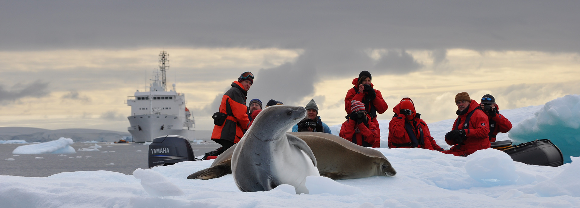 Glistening blue-tinted glaciers, carved by the elements over time into surreal shapes, harbor huge colonies of sea birds and emperor, chinstrap and Adelie penguins. Elephant and Weddell seals are seen lounging on the flats and hum...