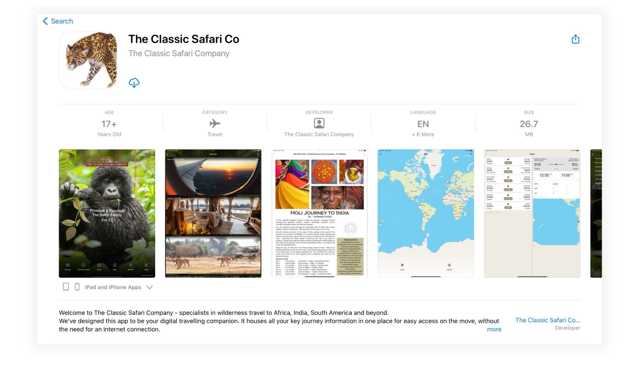 To start viewing your travel documentation you will need to download, at no cost, The Classic Safari Co App on your Phone, iPad or Tablet by following these steps: